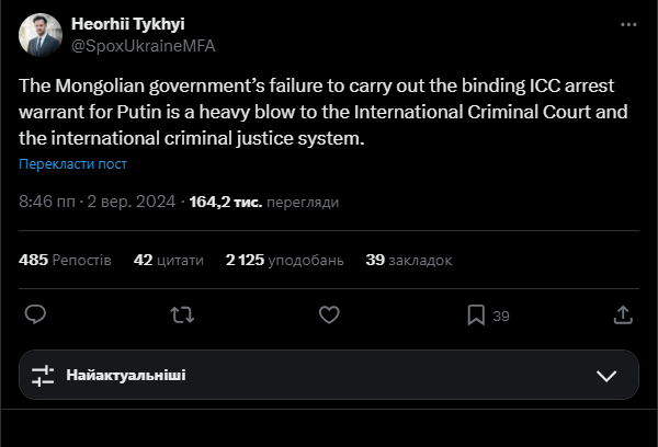 За словами Тихого, відмова Монголії виконувати обов’язковий ордер МКС на арешт Путіна “є важким ударом по Міжнародному кримінальному суду та міжнародній системі кримінального права”.