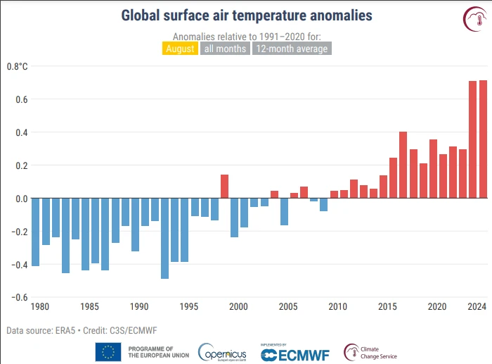 А серпень виявився тринадцятим місяцем поспіль, коли середня світова температура на 1,5 С перевищила рівень температур у доіндустріальну епоху.