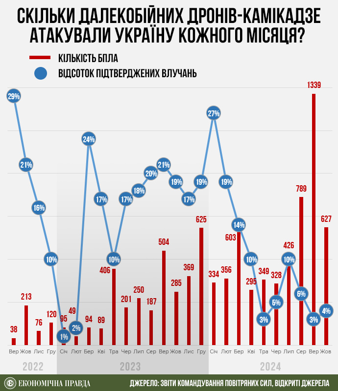 З січня по вересень 2023-го року Росія випустила по Україні 1875 далекобійних дронів-камікадзе, а цього року за такий же період – 4819.