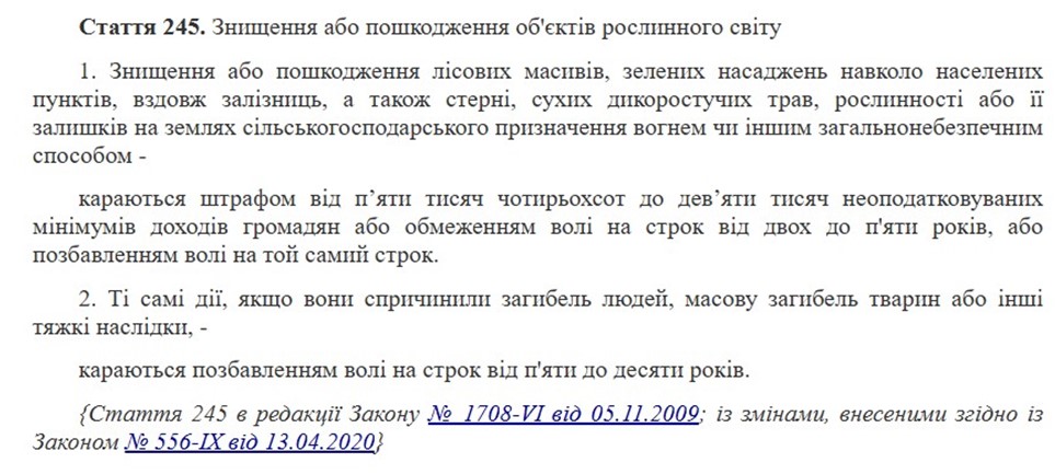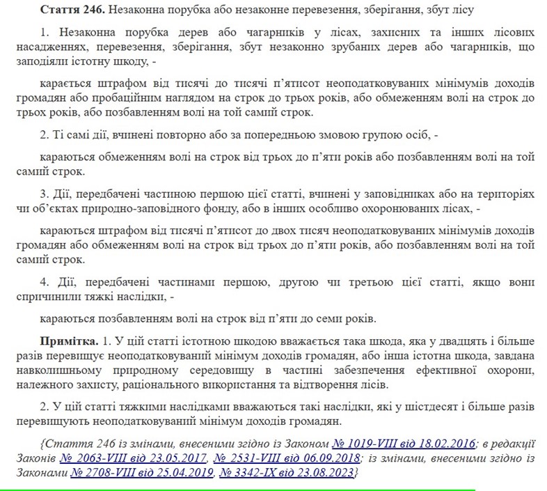 Головна зміна – чинну статтю 246 «Незаконна порубка або незаконне перевезення, зберігання, збут лісу» розділили на дві частини. Відповідно до нових змін до Кримінального кодексу (це якщо закон буде підписано та зміни набудуть чинності), стаття 246 тепер називається «Незаконне вирубування, пошкодження або знищення дерев чи чагарників». А стаття 246-1 – «Незаконне перевезення, зберігання, збут дерев, чагарників або деревини».