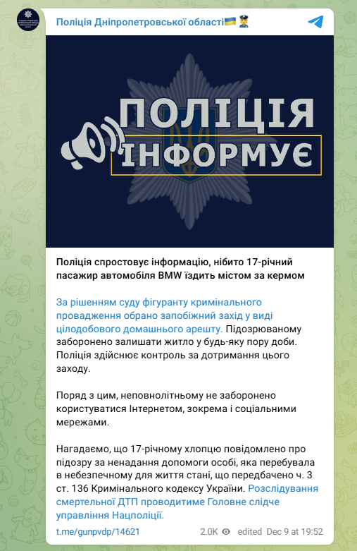 Поліція Дніпропетровської області відреагувала на повідомлення громадян, запевнивши, що неповнолітній підозрюваний перебуває під цілодобовим домашнім арештом згідно з рішенням суду. Йому заборонено залишати місце проживання, і ця заборона суворо контролюється.