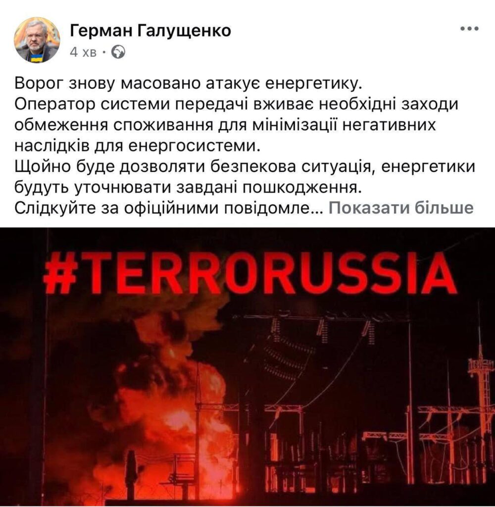 Міністр енергетики України Герман Галущенко наголосив, що удари по енергетиці є частиною масштабної стратегії Росії, спрямованої на підрив економічної та соціальної стабільності в Україні.
