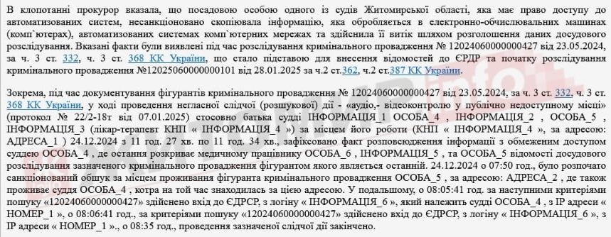 Суддя, дізнавшись про обшуки у батька, зайшла в державний реєстр, де знайшла відомості про заплановані обшуки, списки можливих підозрюваних та імена заявників. Надалі вона передала цю інформацію своєму батькові та його колезі.