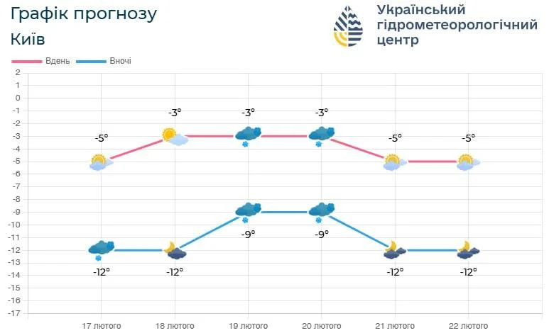 Найближчими днями температура в Києві коливатиметься до -3°, а з 21 числа очікується максимум -5°. Вночі стовпчик термометра опуститься до -9°, а після 21 лютого – до -12°.
