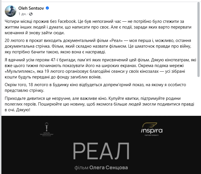 Чотири місяці мовчання у соцмережах були для автора фільму «Реал» періодом тиші та переосмислення. Але настав час повернутися, щоб розповісти про важливе — документальний фільм, який 20 лютого виходить у прокат.