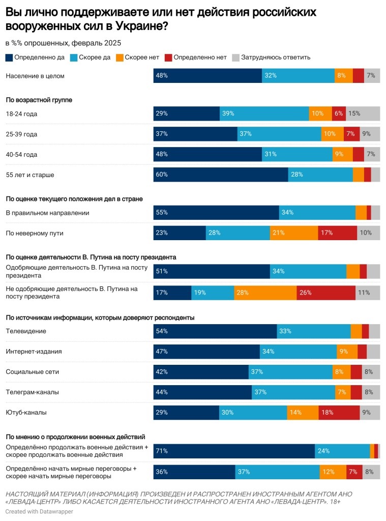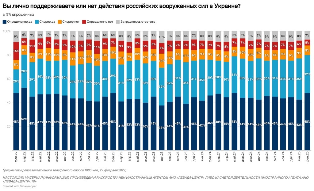 Водночас рівень тих, хто виступає проти воєнних дій, впав до мінімальних 13%. Про це свідчать дані опитування, проведеного “Левада-центром”, який позиціонує себе як незалежна соціологічна організація.