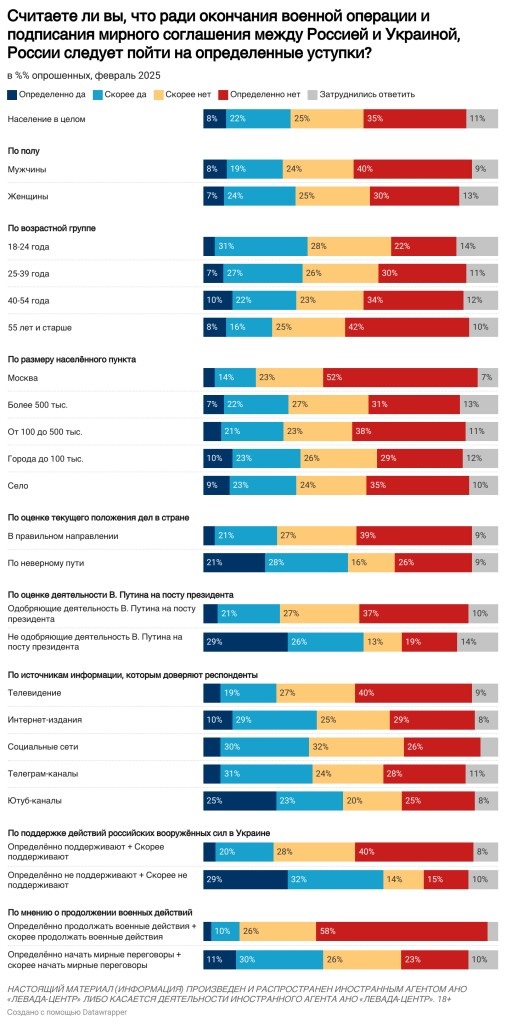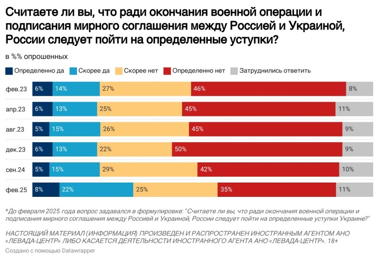 Шестеро з десяти респондентів вважають, що Росії не варто йти на жодні поступки заради підписання мирної угоди з Україною. Лише троє з десяти погоджуються на певні компроміси.