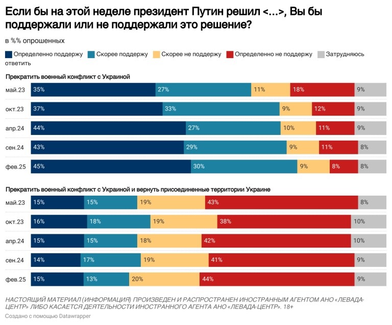 Згідно з дослідженням, три чверті опитаних (75%) заявили, що підтримали б рішення Володимира Путіна припинити війну. Однак, якщо це передбачає повернення окупованих територій Україні, підтримка різко падає – лише 28% росіян згодні на такий сценарій.