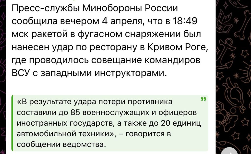 У п’ятницю, 4 квітня 2025 року, російські війська здійснили ракетний удар по житловому району Кривого Рогу, що в Дніпропетровській області. За офіційними даними, загинули 18 осіб, серед яких дев’ять дітей, а понад 60 людей отримали поранення. El País