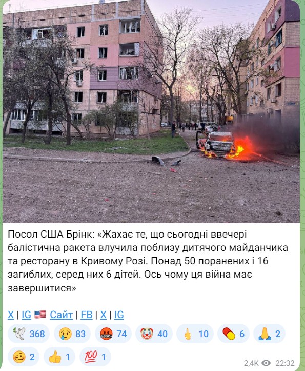 Посол США в Україні Бріджит Брінк висловила співчуття сім’ям загиблих та постраждалих, закликавши до посилення міжнародного тиску на росію для припинення агресії. Посолка засудила удар по Кривому Рогу, але не вказала, хто саме вбив дітей.
