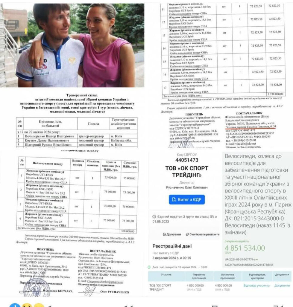 В українському спортивному середовищі розгорається новий скандал — цього разу навколо закупівель інвентарю для легкої атлетики, що здійснювалися через фірму, пов’язану з велосипедним спортом. Імена фігурантів — відомі, суми — захмарні, документи — красномовні. Ми розбиралися, як тренери з велосипедного спорту опинилися в епіцентрі фінансових потоків легкоатлетичної інфраструктури