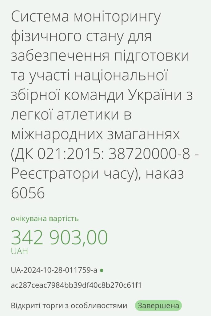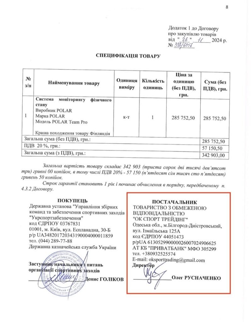 У договорі, підписаному наприкінці 2024 року, значиться, що система моніторингу закуплена «на рік», однак про фактичне її використання або передачу до спортивної бази жодних публічних згадок немає.