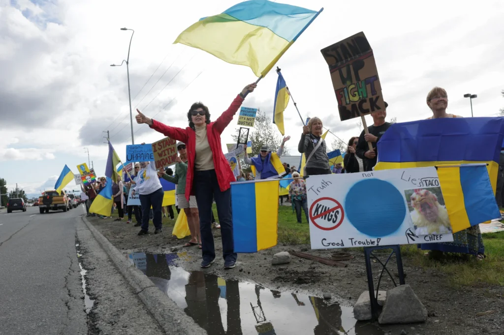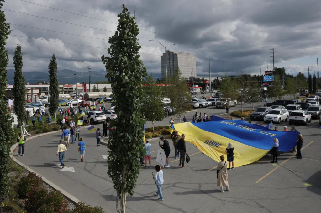 У місті Анкоридж (Аляска, США) за день до зустрічі Дональда Трампа та Володимира Путіна відбулася масштабна проукраїнська акція під гаслом «Україна та Аляска — Росія більше ніколи». Сотні людей вийшли на вулиці з українськими та американськими прапорами, плакатами та гаслами на підтримку незалежності України.