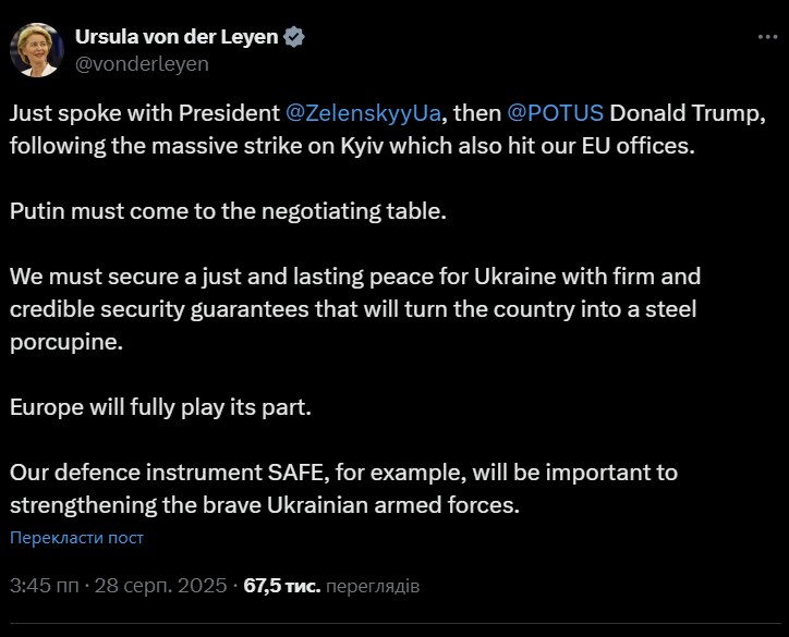У ніч проти 28 серпня російські сили здійснили комбіновану атаку на Київ. Серед уражених об’єктів — офіс Представництва Європейського Союзу в Україні, а також будівля Європейського інвестиційного банку. Урсула фон дер Ляєн висловила стурбованість тим, що Кремль навмисне спрямував удари на дипломатичні структури ЄС, аби показати, що націлений і на сам Союз.