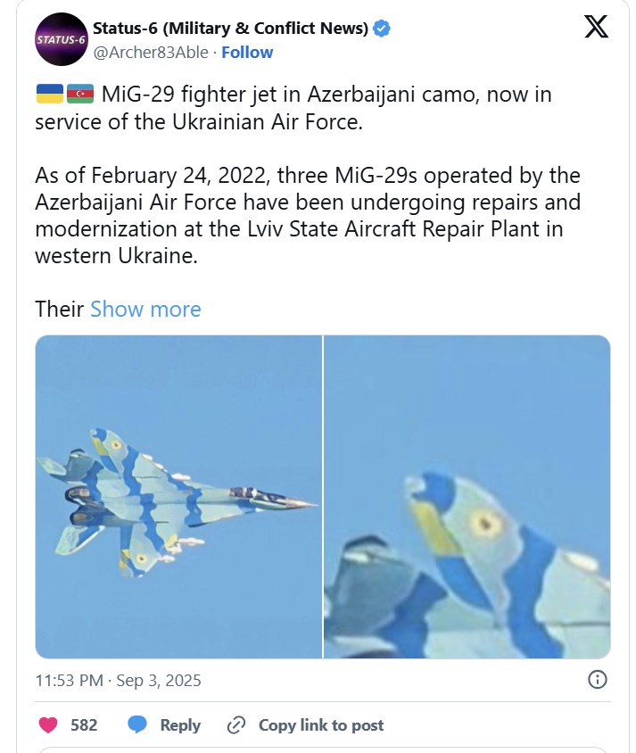 Нещодавно було зафіксовано винищувачі МіГ-29 з азербайджанським камуфляжем в українському небі. Ці літаки, пофарбовані характерними кольорами у блакитних, сірих та фіолетових тонах, тепер мають українські розпізнавальні знаки.