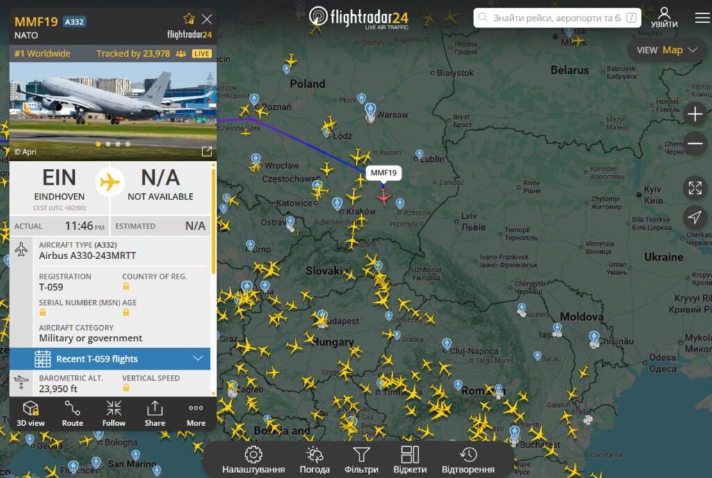 Країни НАТО масово підняли авіацію: літак раннього радіолокаційного спостереження ВПС Італії прямує з Естонії в бік Польщі. Крім того, до кордону з Україною підлітає нідерландський літак-заправник Airbus A330 MRTT (він оновить паливо винищувачів, які вже у повітрі) і літак F-35.