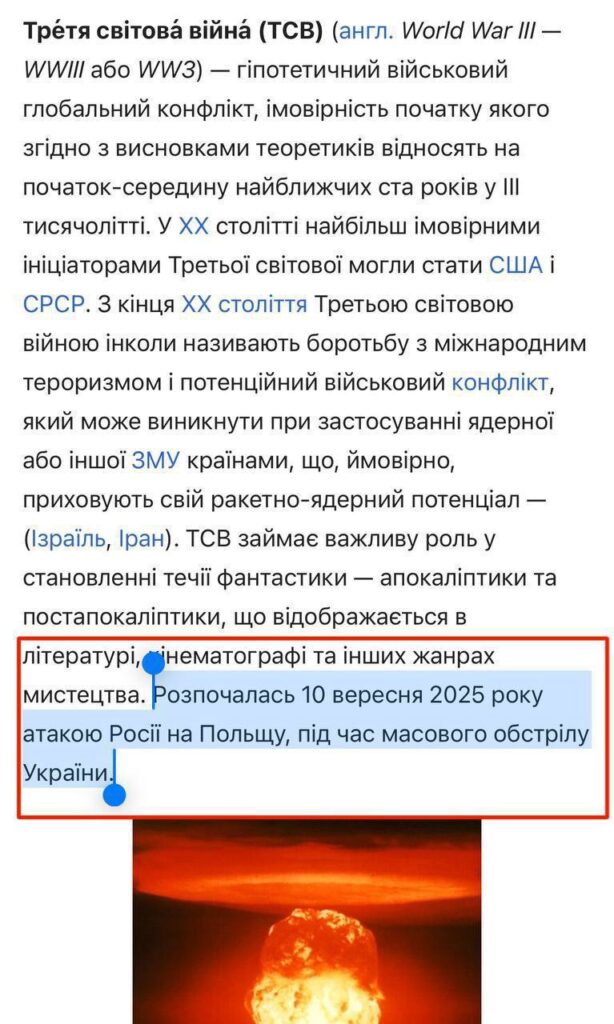 У відкритій енциклопедії «Вікіпедія» в статті про Третю світову війну з’явилося формулювання, що вона розпочалася саме 10 вересня 2025 року атакою Росії на Польщу під час масованого обстрілу України. Цей факт викликав широкий резонанс у соцмережах і став символічним маркером масштабності інциденту.