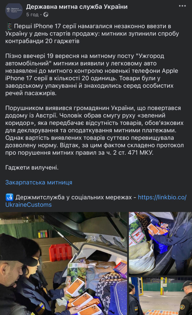 У ніч на 19 вересня на митному посту «Ужгород-автомобільний» Закарпатської митниці правоохоронці та митники виявили першу зафіксовану спробу нелегального ввезення iPhone 17 в Україну. У сумках та особистих речах двох громадян, які поверталися з Австрії, знайдено 29 нових смартфонів — 20 у автомобілі Subaru та 9 у Mercedes-Benz.