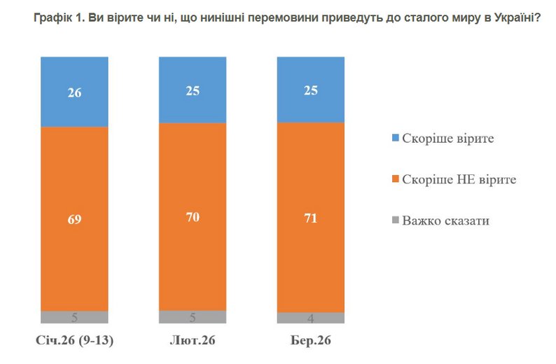 Так, 71% респондентів не вірять, що нинішні переговори можуть привести до сталого миру. Водночас 25% мають протилежну думку.