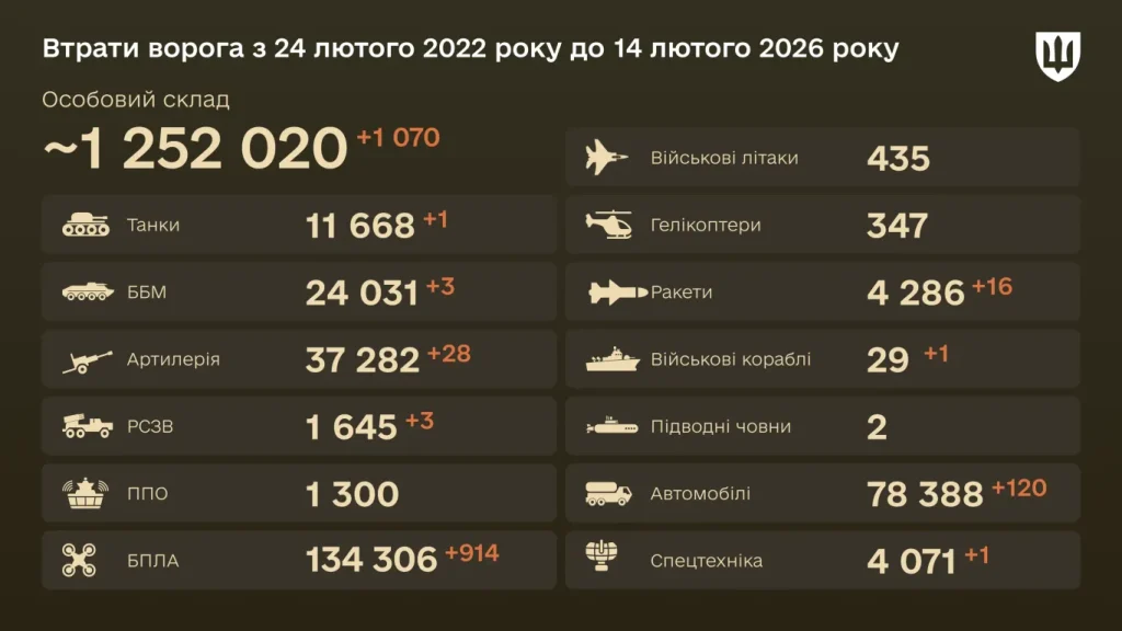 За даними Генерального штабу, загальні бойові втрати противника з 24.02.22 по 14.02.26 орієнтовно склали
