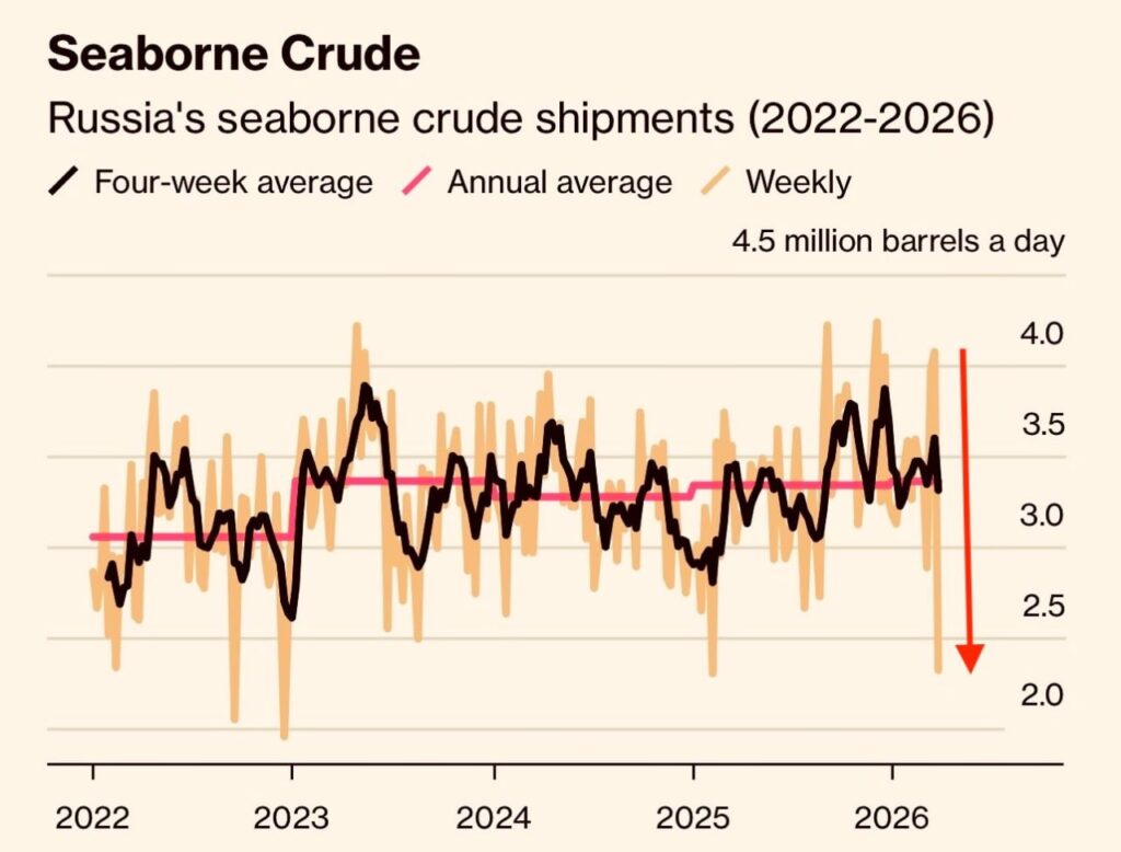 За даними Bloomberg, експорт нафти рф морем за останній тиждень впав із приблизно 4,1 млн барелів на добу до близько 2,3 млн. Тобто мінус майже половина. Причина — не «відсутність попиту» і не «ринкові коливання». Причина значно прозаїчніша:
