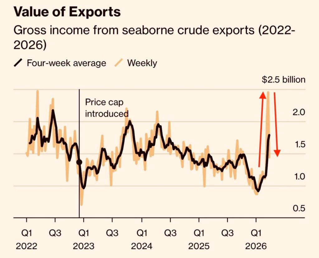 Але тут виникає класична проблема: експорт нафти рф — це не лише ціна, а фізичний обсяг.І коли обсяг падає настільки різко, навіть подорожчання не рятує ситуацію.