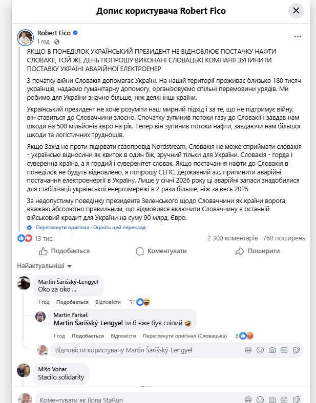 Прем’єр-міністр Роберт Фіцо заявив, що може ініціювати припинення постачання електроенергії Україні, якщо Київ до понеділка не відновить транзит російської нафти до Словаччина. За його словами, постачання електроенергії Україні буде призупинене вже того ж дня, якщо вимоги не будуть виконані.