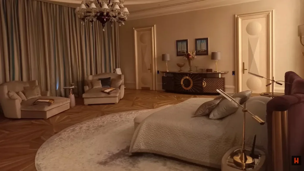 ФБК оприлюднив фото інтер’єрів маєтку. Зокрема, вітальню площею 233 м² з мармуровим каміном і столом на 20 людей. Поруч розташована спальня площею 154 м² та мармурова ванна кімната з джакузі.