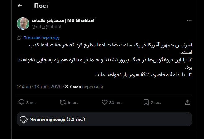 Ще 17 квітня міністр закордонних справ Ірану Аббас Аракчі заявляв про відкриття Ормузької протоки на тлі припинення вогню між Ізраїлем і Ліваном. Цю інформацію також підтверджував Дональд Трамп.
