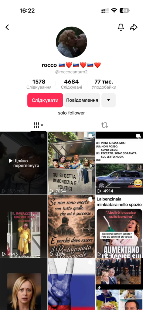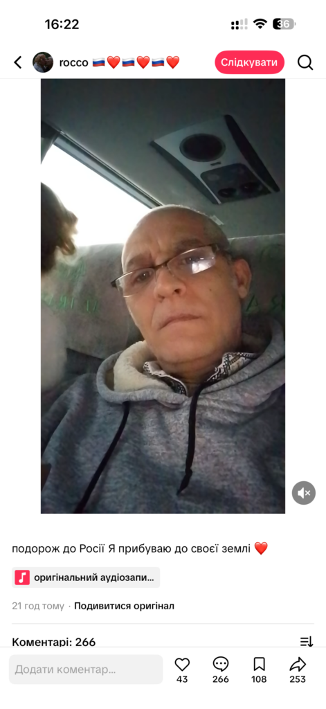 Нижче приводимо скріни з Тік-току цього італійця, де він пише про те що прибуває “до своєї землі росії” і це всього лише 21 годину тому.