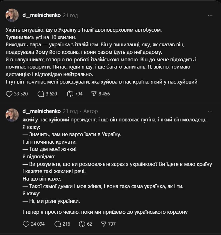 Про подію розповіла пасажирка автобуса Дар’я Мелніченко у соцмережі Threads. За її словами, конфлікт виник під час однієї із зупинок. До неї підійшов громадянин Італії, одягнений у вишиванку, який почав розмову після того, як почув, що вона спілкується італійською мовою. Чоловік пояснив, що український національний одяг йому подарувала дружина, з якою вони разом прямують до України.