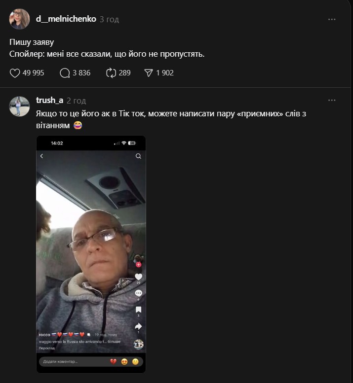 Згодом авторка допису повідомила, що після прибуття до пункту пропуску вона поспілкувалася зі старшою зміни. Після цього Рокко та його дружину запросили на додаткове опитування. За словами Дар’ї, їй повідомили, що італійця, ймовірно, не пропустять через його висловлювання.