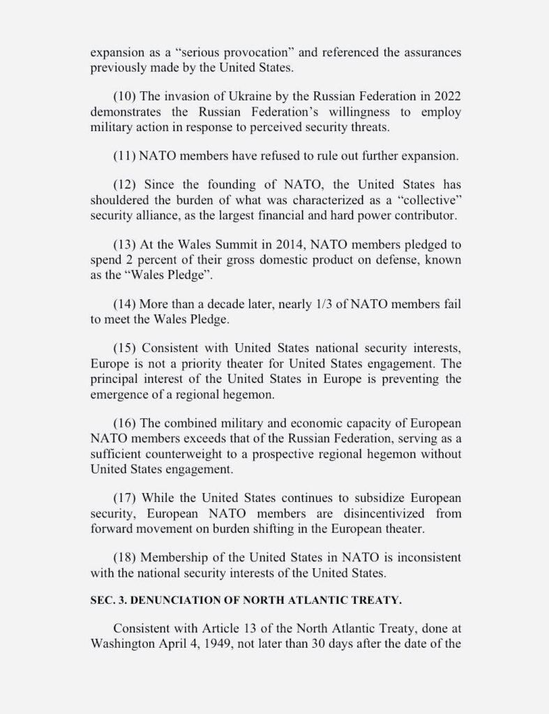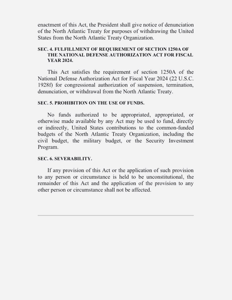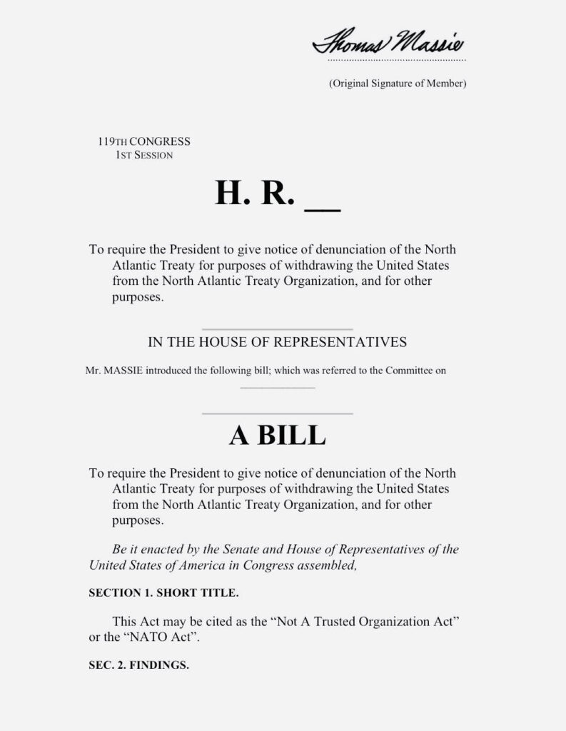У законопроєкті HR 6508 політик вимагає, щоб президент США офіційно повідомив Північноатлантичний альянс про вихід держави. Массі також стверджує, що початкова мета НАТО більше не відповідає сучасним національним інтересам Вашингтона. А європейські союзники мають достатній потенціал, щоб самостійно гарантувати власну безпеку.