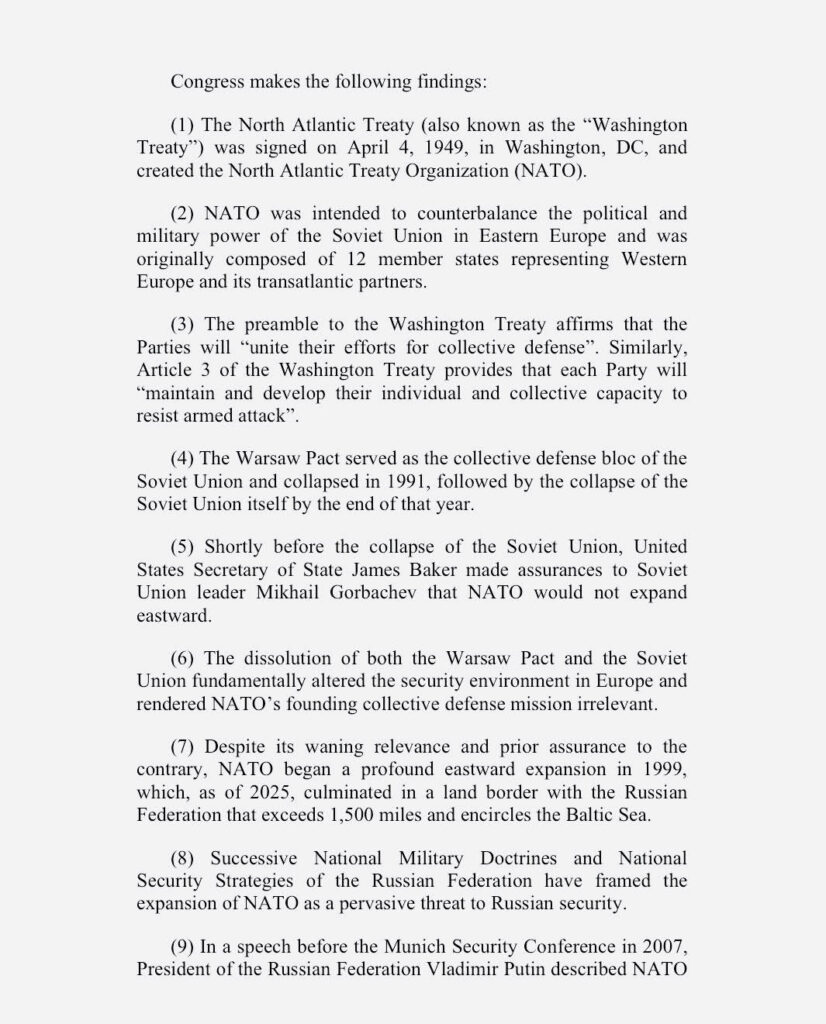 США можуть офіційно розглянути питання про вихід із НАТО — відповідний законопроєкт подав до Конгресу конгресмен-республіканець Томас Массі. Про це він повідомив у своєму акаунті в соцмережі X 10 грудня.