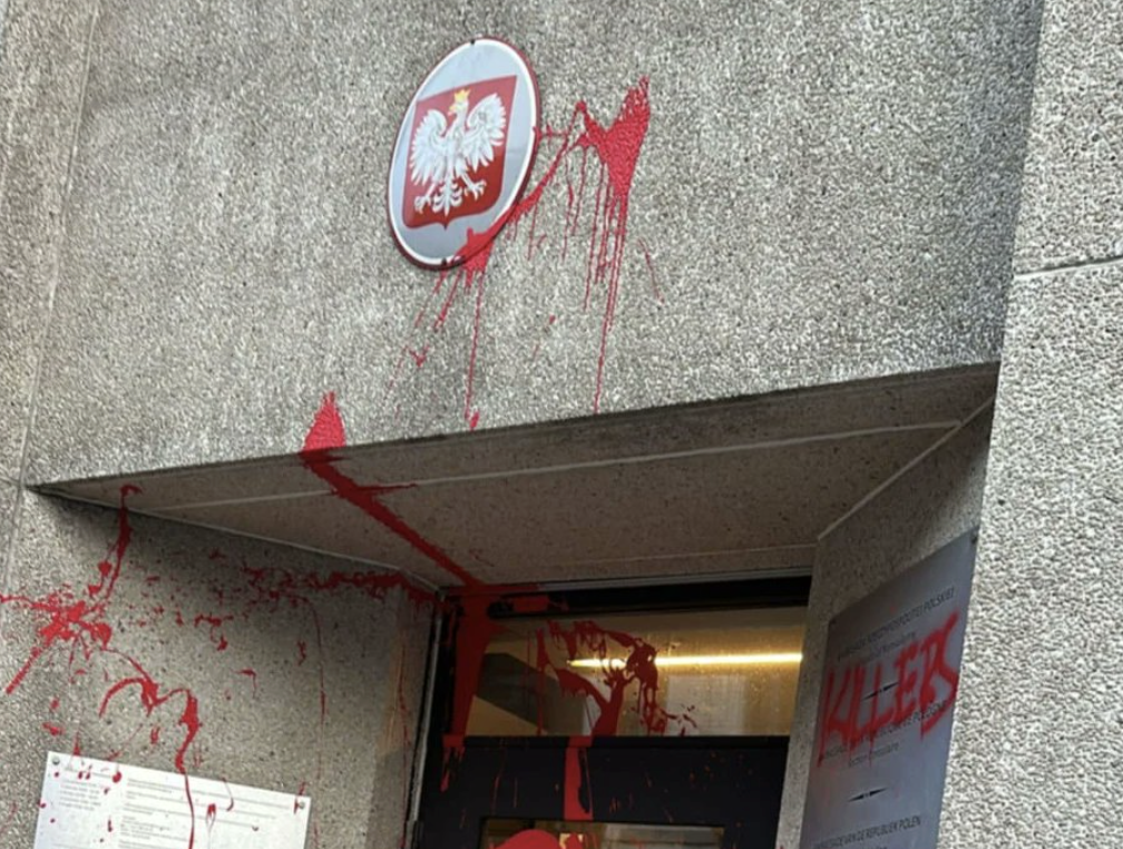 У Брюсселі невідомі розлили на будівлю польського консульства червону фарбу та залишили написи «Вбивці» англійською мовою і «До біса стіну». Червоною фарбою залили двері, фасад установи та табличку з польським гербом, а перед входом розкидали собачі фекалії.