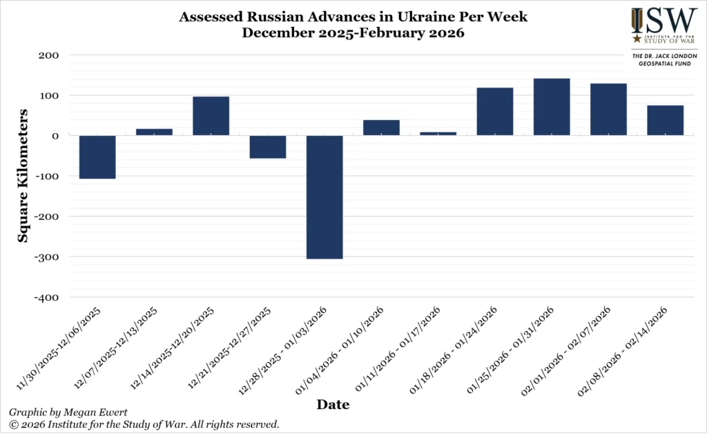 За оцінками ISW, з кінця листопада 2025 року до середини лютого 2026 року тижневі показники просування російських військ суттєво коливалися. Найбільший приріст зафіксовано у період з 25 по 31 січня — тоді окупанти захопили близько 141 квадратного кілометра.