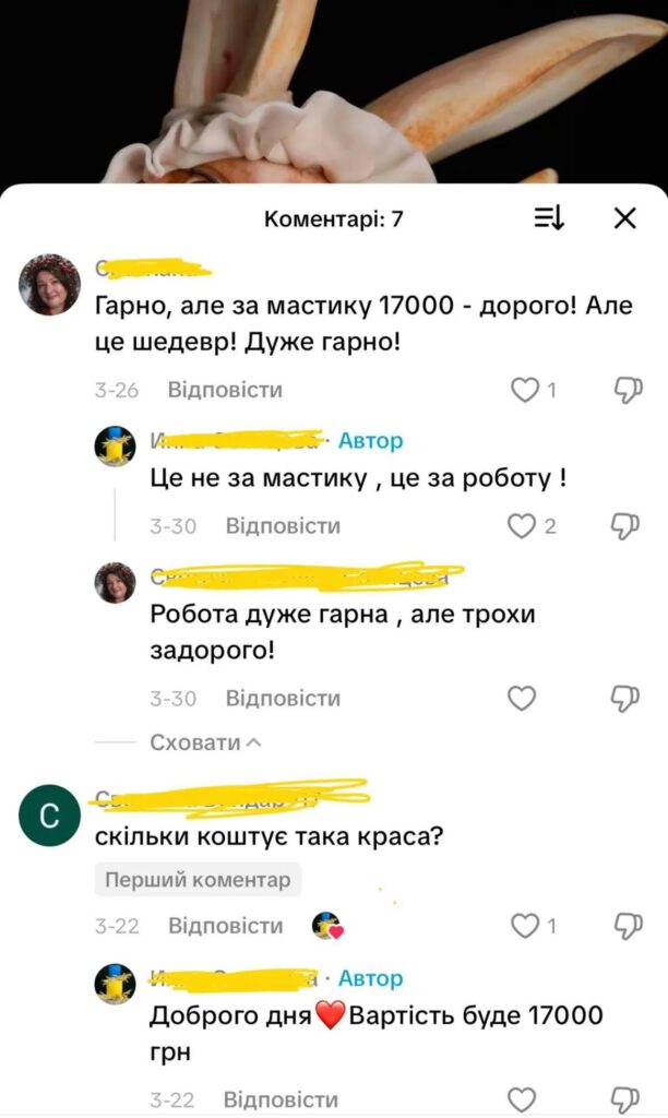Окремо українські медіа згадують і конкретних кондитерів, які працюють у преміальному сегменті. Зокрема, як повідомляє 1+1, подібну дорогу паску створила кондитерка Інна Солнцева.