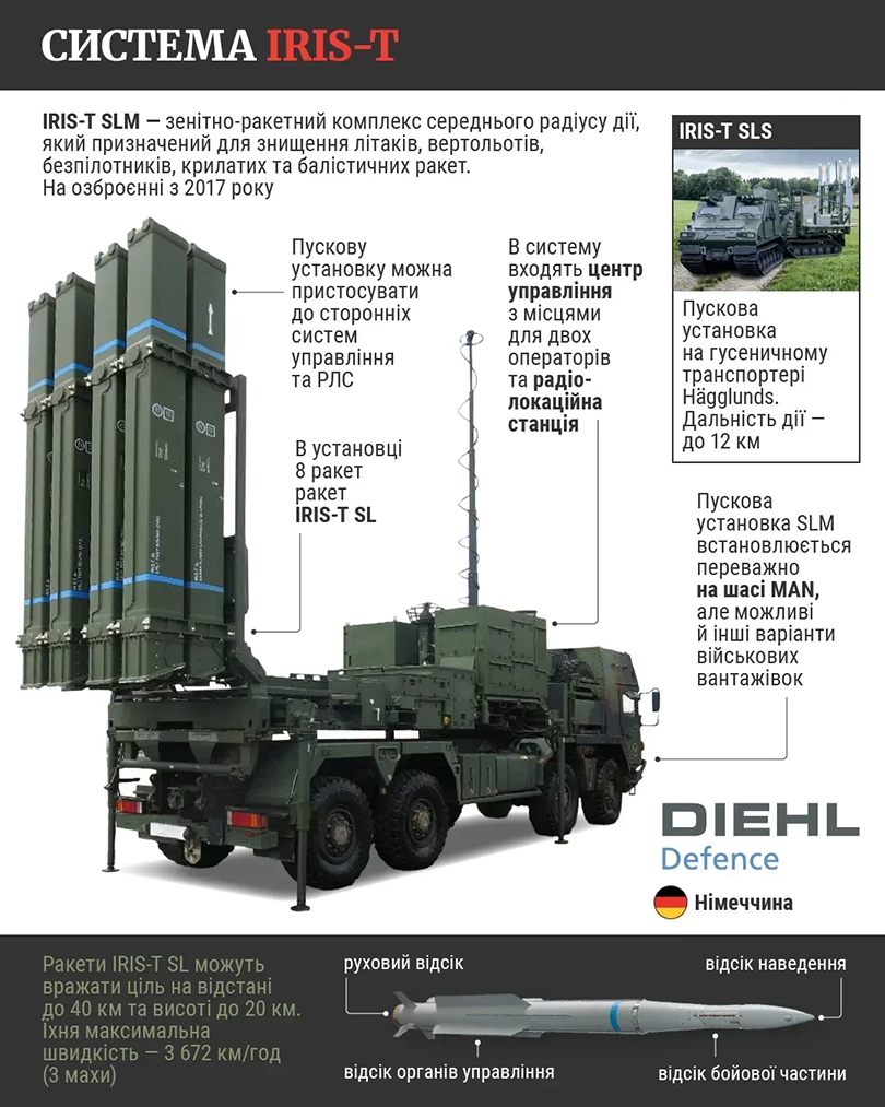Раніше генеральний директор компанії Diehl Defence Гельмут Раух повідомляв, що Україна замовила загалом 18 систем ППО моделі IRIS-T. Частина з них уже передана, а решта перебуває на різних етапах виробництва та підготовки до постачання.