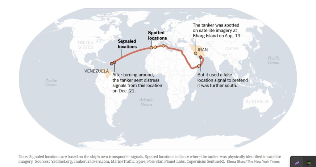 Танкер Bella 1 перебуває під санкціями США з минулого року за транспортування іранської та венесуельської нафти. За даними американських федеральних органів, така нафта продається з метою фінансування тероризму. Останнім часом судно змінило курс на північний захід — імовірно, у напрямку Гренландії або Ісландії — і, за оцінками посадовців, наразі не перевозить жодного вантажу.