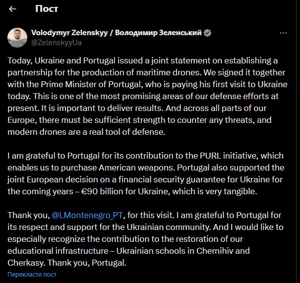 Президент також подякував Португалії за внесок у програму PURL, яка дозволяє Україні закуповувати американську зброю. Також за підтримку спільного європейського рішення щодо фінансової гарантії для України — 90 мільярдів євро на найближчі роки. За його словами, ця допомога є “дуже відчутною” та критично важливою для оборони.