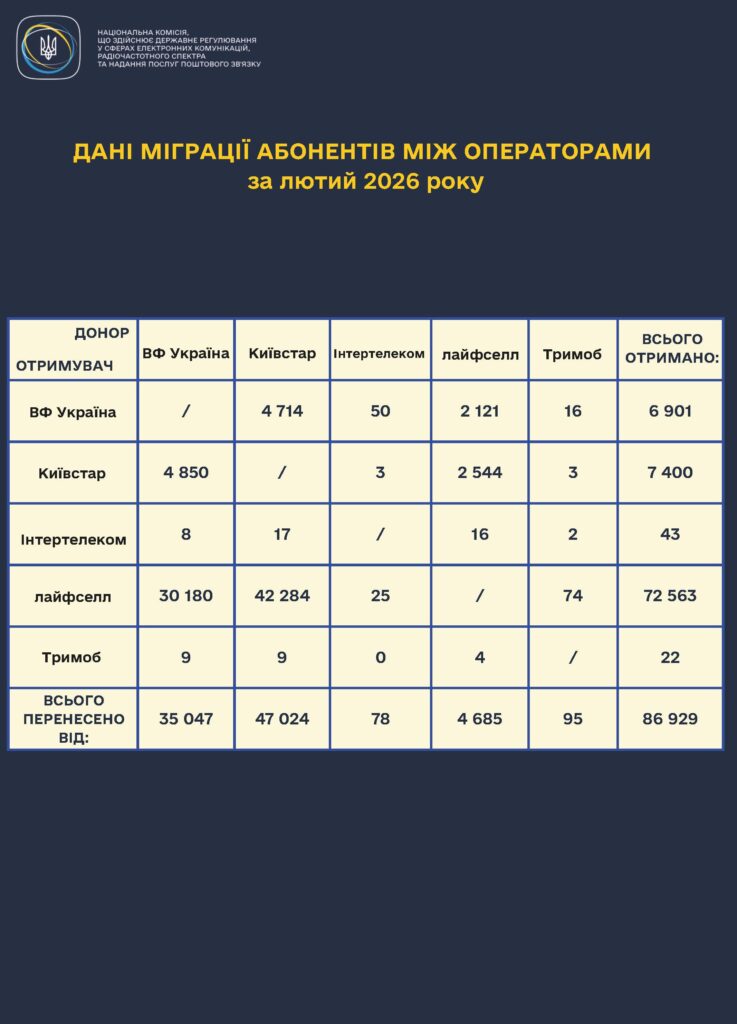 Згідно з даними регулятора, загалом 86 929 абонентів скористалися послугою перенесення номера у лютому 2026 року.