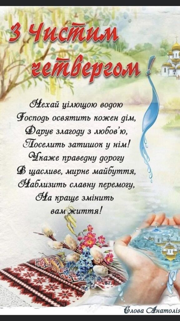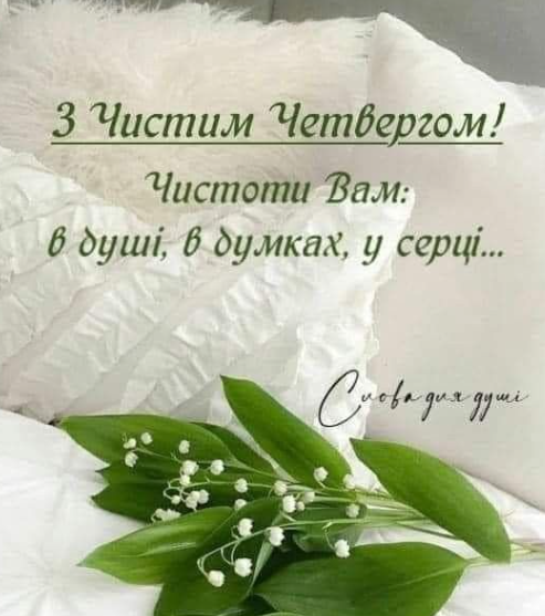 Вітаю зі світлим Чистим четвергом! Нехай сьогоднішня молитва буде почута, а кожне добре слово повернеться до вас сторицею. Бажаю жити в мирі з собою та навколишнім світом, зберігаючи чистоту душі щодня.