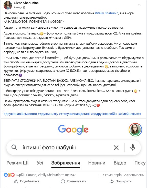 За її словами, після початку повномасштабної війни родина була змушена жити на відстані, і подружжя шукало способи зберігати близькість у складних умовах. Олена Шабуніна підкреслила, що інтимність у парі не може бути предметом публічного осуду або інструментом тиску.