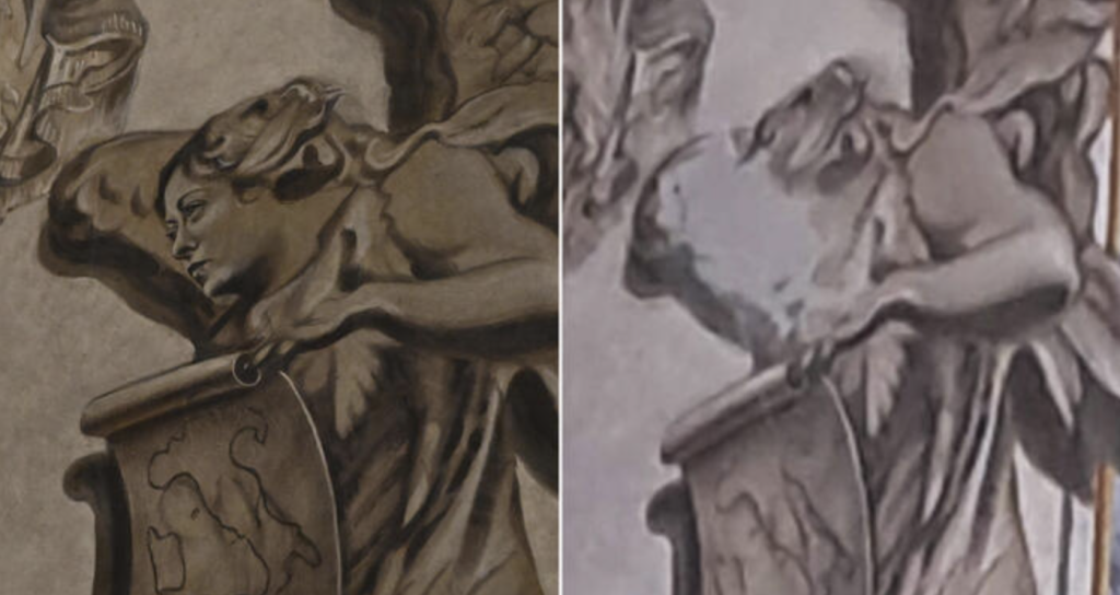 Фреску створили у 2000 році, вона не має статусу об’єкта культурної спадщини. Через пошкодження водою автора роботи Бруно Валентінетті запросили провести реставрацію, після якої і виникла суперечка.