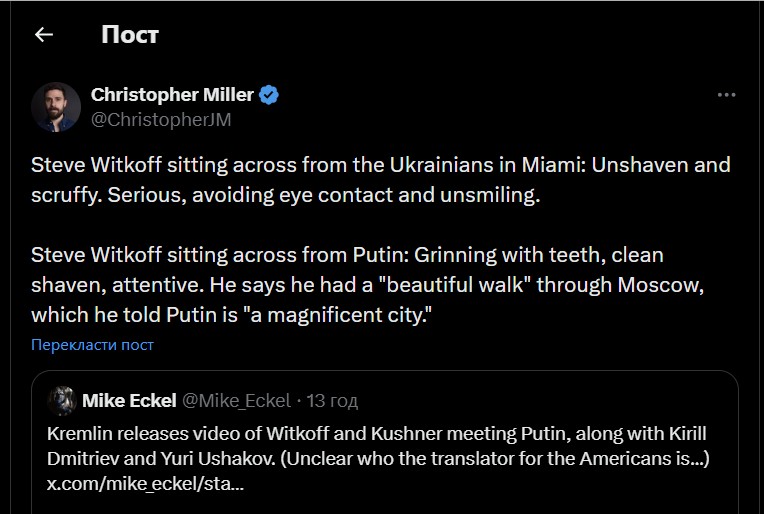 - На зустрічі з путіним він уже був гладко виголений, посміхався на всі зуби та демонстрував зацікавленість. Віткофф навіть заявив, що мав «прекрасну прогулянку» москвою та назвав її «чудовим містом».
