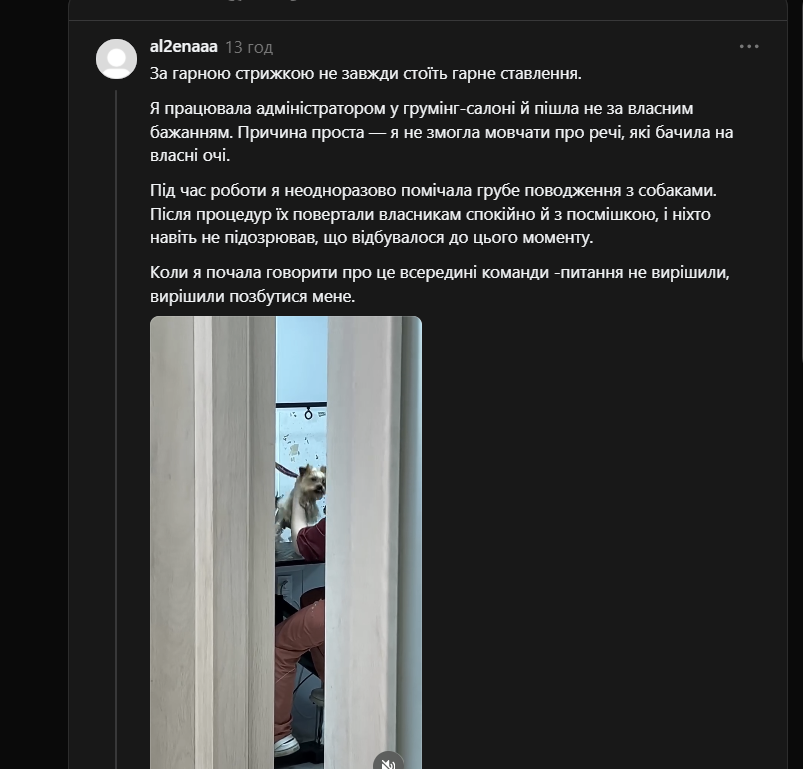 Йдеться про публікацію колишньої співробітниці грумінг-салону, яка заявила про можливе жорстоке поводження з собакою під час процедур. За її словами, вона працювала адміністраторкою і стала свідком неналежного ставлення до тварин.